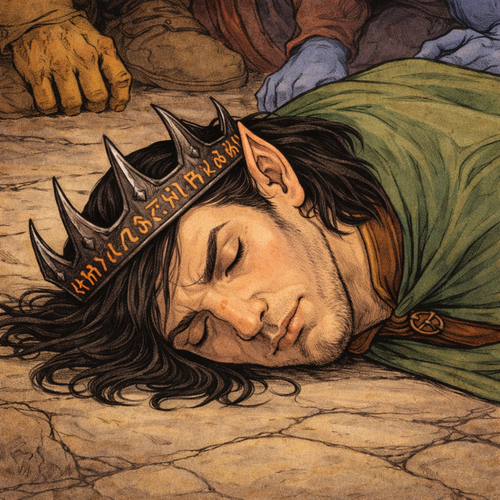Even as he spoke, his gaze betrayed him. Again and again, his eyes drifted to the crown on the floor, his attention pulled like iron filings toward a lodestone. The others noticed. Concern passed silently between them.
