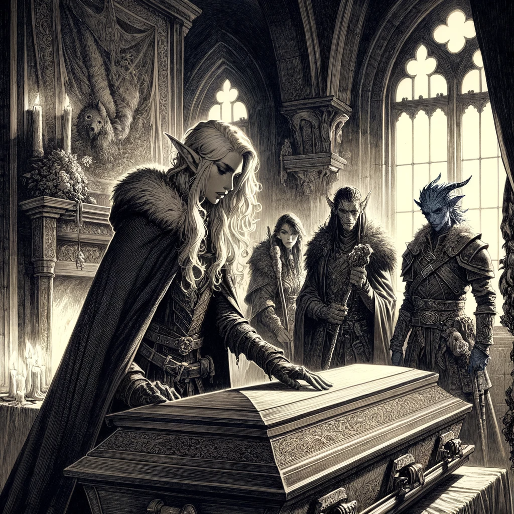 The Nefarious Do-Gooders, ever the champions of the downtrodden, agreed to Ismark’s requests: a solemn burial for the Burgomaster and a perilous journey to Vallaki, where Ireena might escape the reach of Strahd’s shadow. Before they could embark on this quest, Ireena insisted upon a proper burial for the man who had been both father and protector to her.