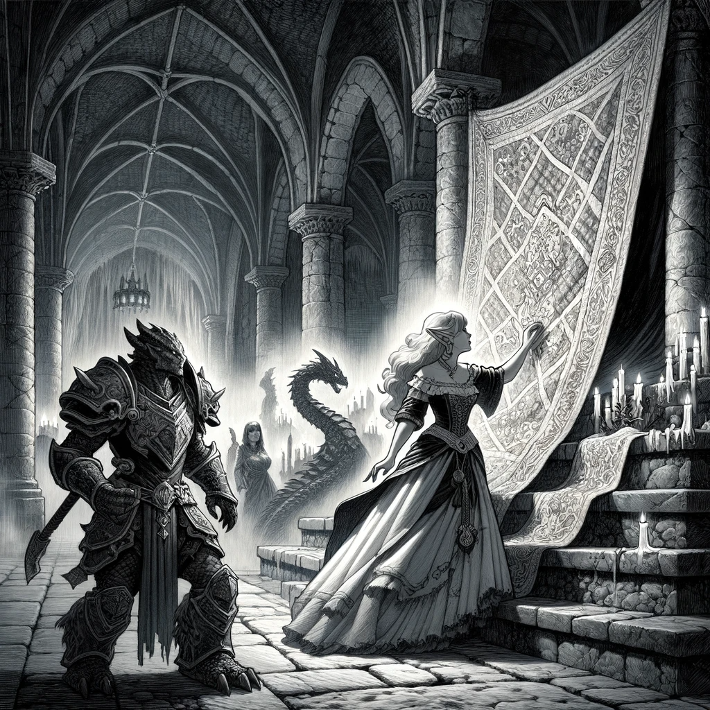 As they continued their exploration, the crypts revealed their secrets one by one. A crypt door, resistant to Maledurk’s brute strength, eventually gave way to his crowbar, the stone slab sliding aside with a grating sound that echoed ominously. Within, they found a skeleton, its rags the remnants of once-fine attire, lying atop a marble slab. A quilt, miraculously preserved and depicting a royal feast, hung behind it, its vibrant colors a stark contrast to the decay around them.