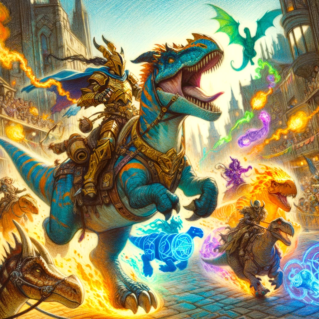 Elora, not to be outdone, spurred Big Honker forward with a deft hand, the massive tyrannosaurus responding with a surge of speed. Maledurk, atop the ill-tempered allosaurus Bone Cruncher, hung on tight as he whispered encouragement into the beast’s ear, his words nearly drowned out by the thundering footsteps and the roar of the crowd.