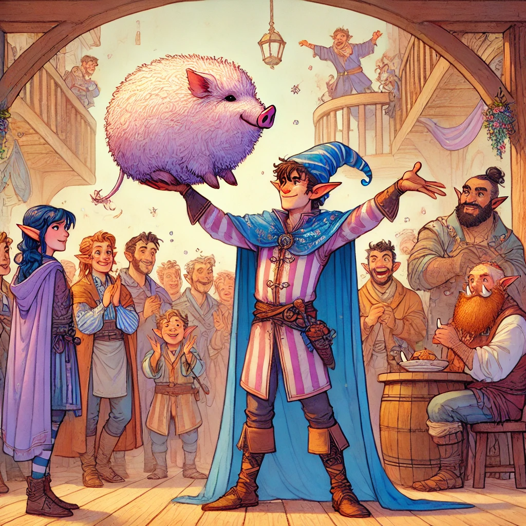 Krenn Smith, the half-elf wizard, stood poised with a confident smirk. His final Firebolt spell struck the box with precision, earning him the title of champion. The crowd erupted in cheers, and an orc chef named Tolk approached, presenting Krenn with a mysterious satchel. Within the dark confines of the bag, Krenn found a fuzzy ball that, with a bit of conjuration magic, transformed into a friendly boar named Gore. The tavern’s patrons marveled at the unusual prize, adding to the evening’s jubilant atmosphere.