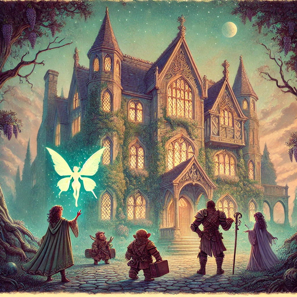 The ancient grandeur of Strixhaven’s Captain Dapplewing’s Manor loomed under a moonlit sky, casting elongated shadows as the adventurers—students of the prestigious college—prepared to embark on their midnight quest. The stone façade of the manor, veined with ivy and time-worn, bore silent witness to the anticipation crackling in the air. Luna, the fairy druid, hovered above the ground, her wings shimmering with an ethereal glow. Beside her, Bob, the sturdy dwarf fighter, adjusted his armor, a determined gleam in his eyes. Krenn Smith, the half-elf wizard, clutched his staff, his mind racing with arcane possibilities, while Ophelia, the human sorcerer, let her fingers dance with flickers of magical energy, prepared for whatever lay ahead.
