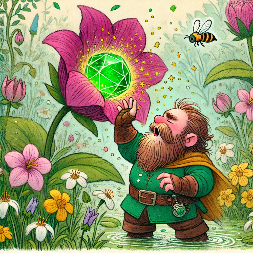 Driven by curiosity and his dwarven affinity for precious stones, Bob didn’t hesitate. He vaulted over the railing and waded through the sea of flowers. Pollen filled the air, causing him to sneeze, but he pressed on, reaching the gem—a bright green emerald. As he grasped it, he felt a surge of energy but thought little of it as he rejoined his companions.