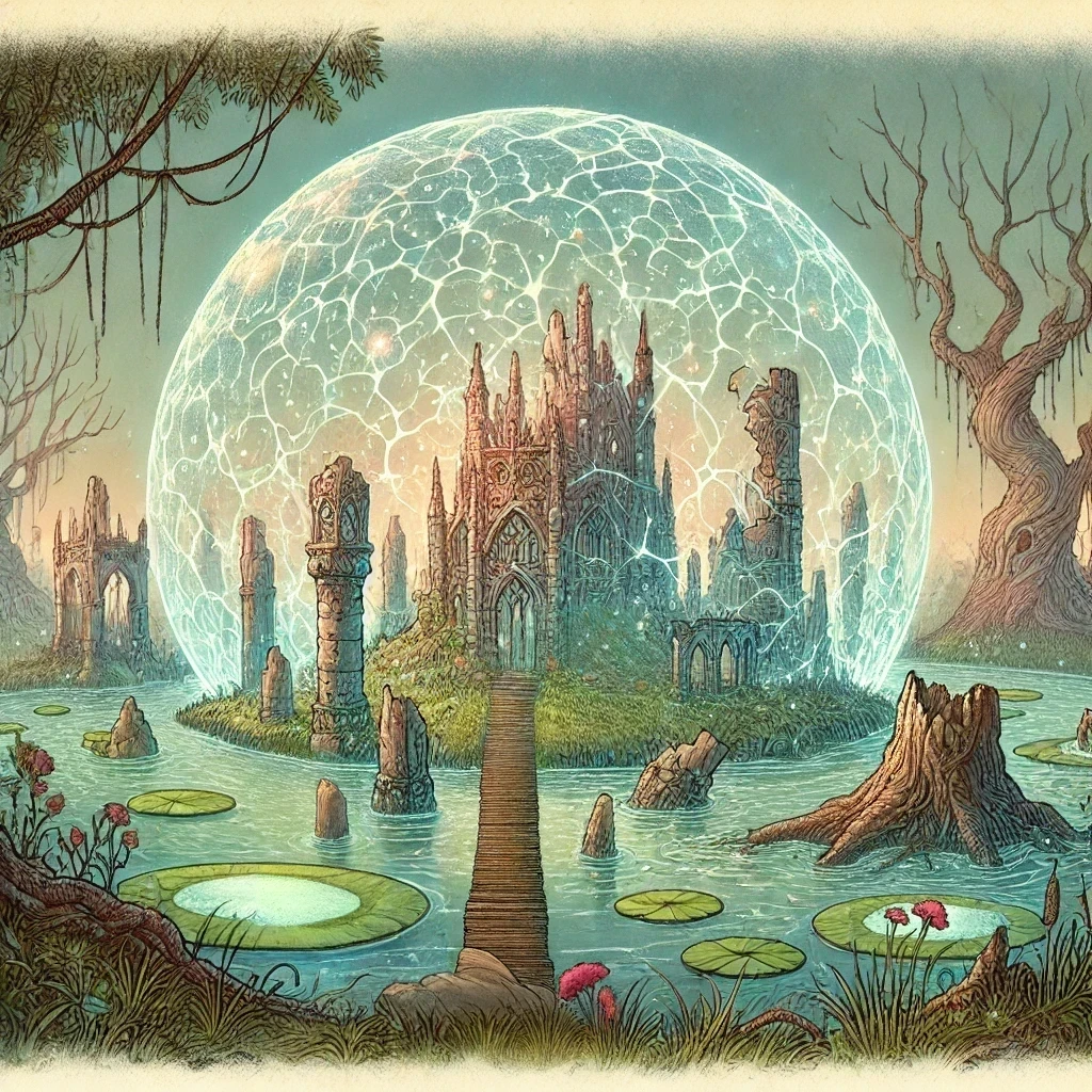 Yet the most daunting discovery lay atop the broken causeway—a shimmering magical dome encasing the fortress grounds. Tendrils of arcane energy crackled across this barrier, ready to repel anyone or anything that dared approach. Experimental prods with conjured flames and spectral hands found the dome sealed tight, destroying each magical test in a flurry of sparks.